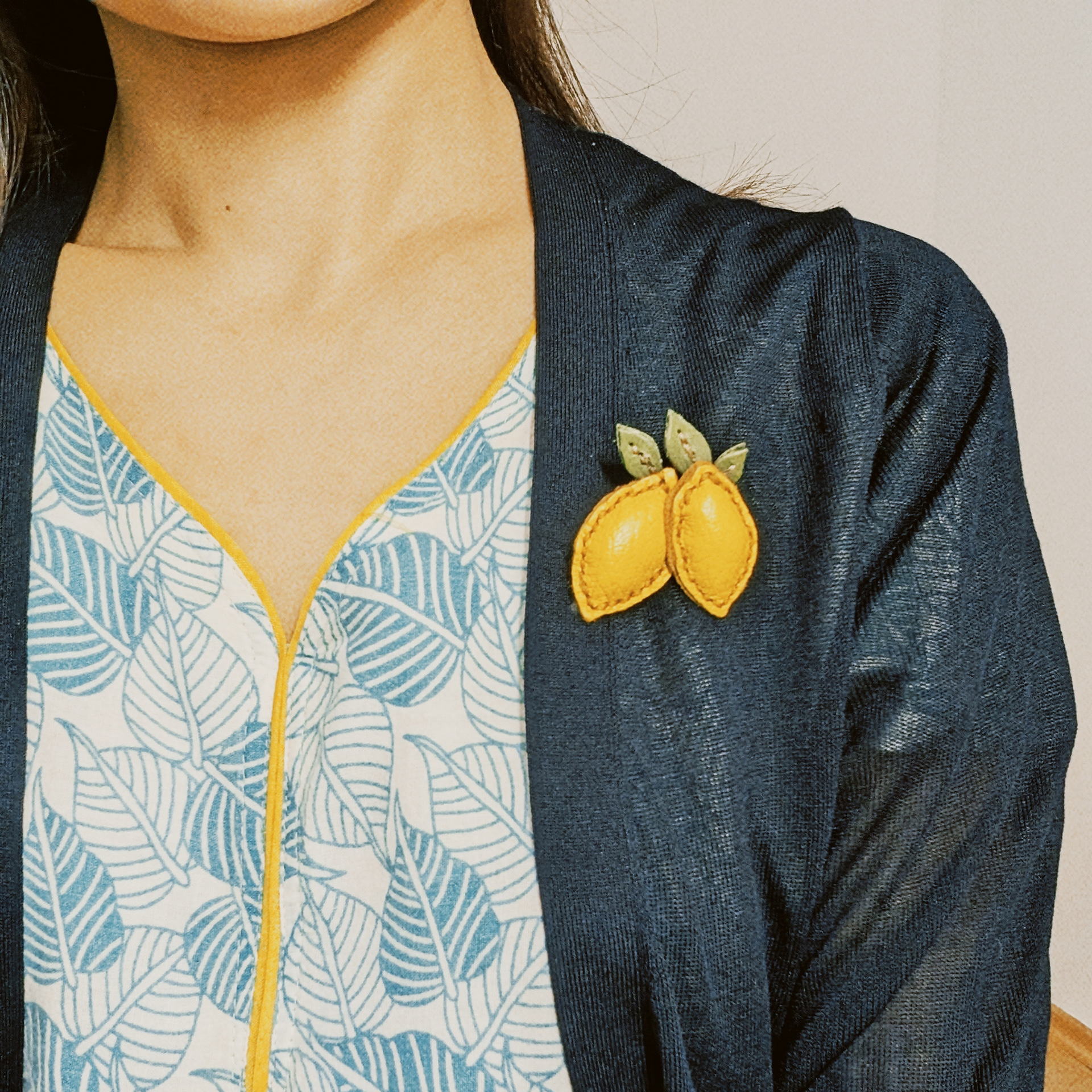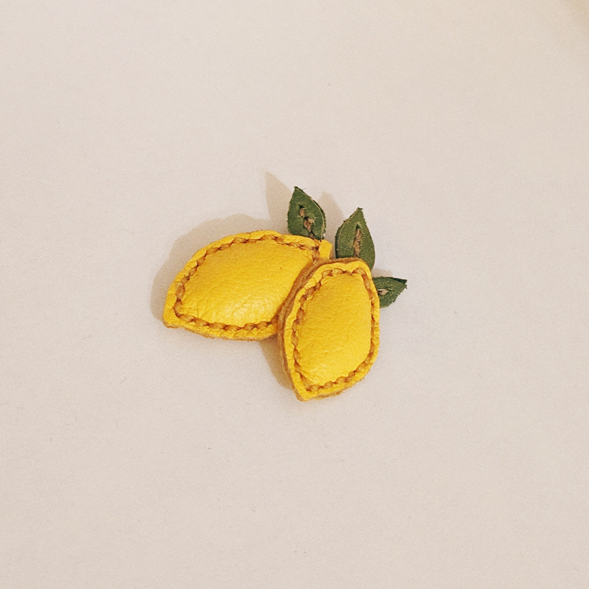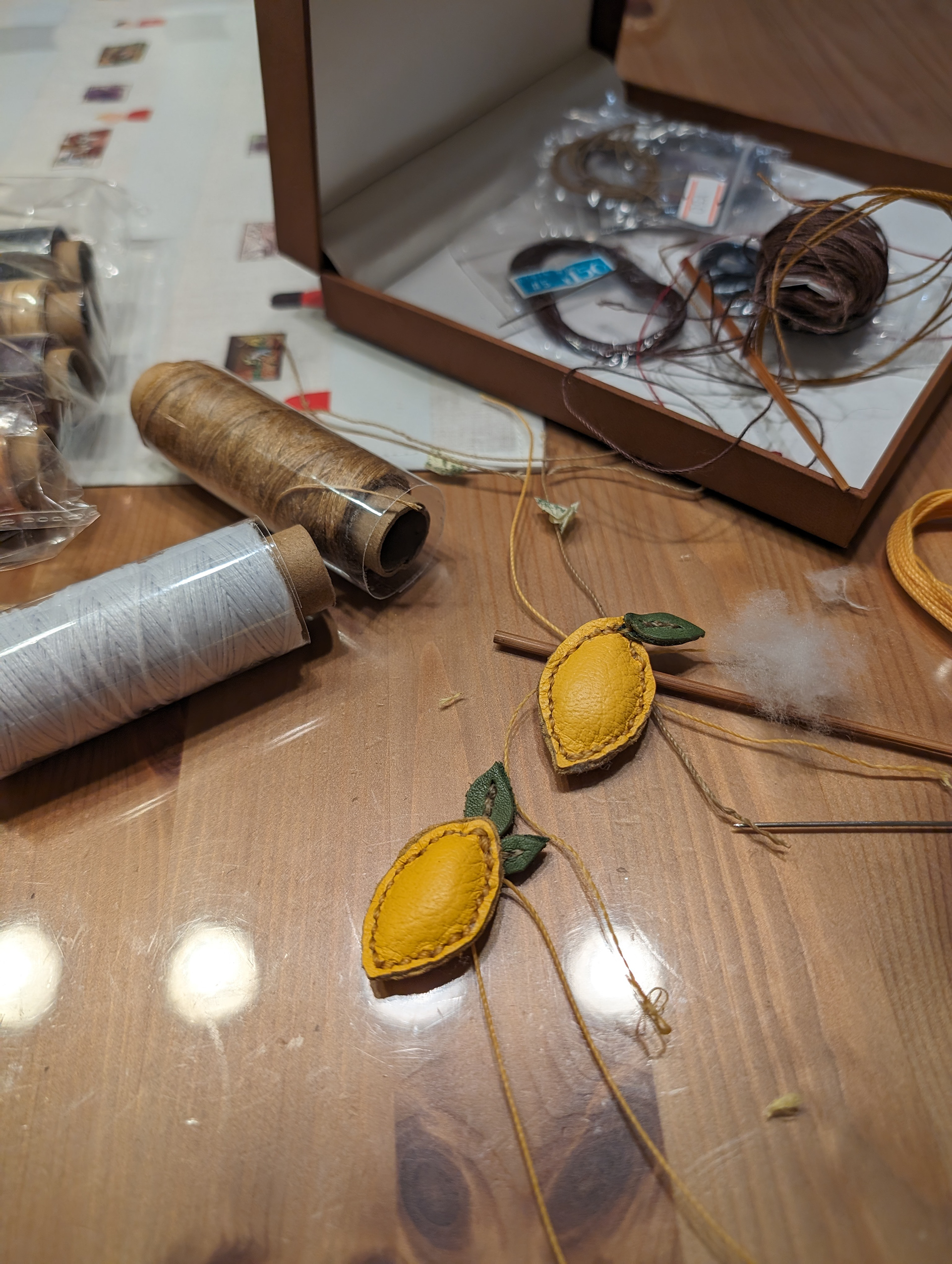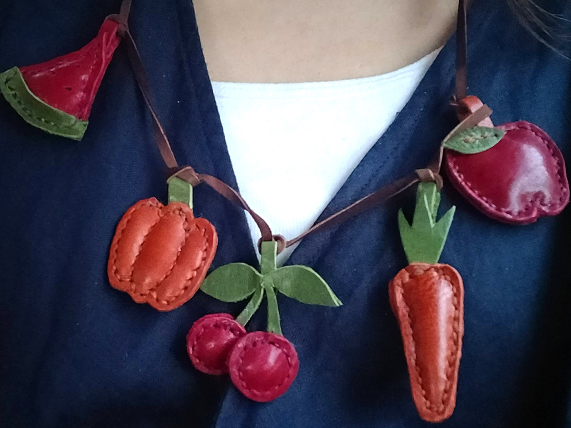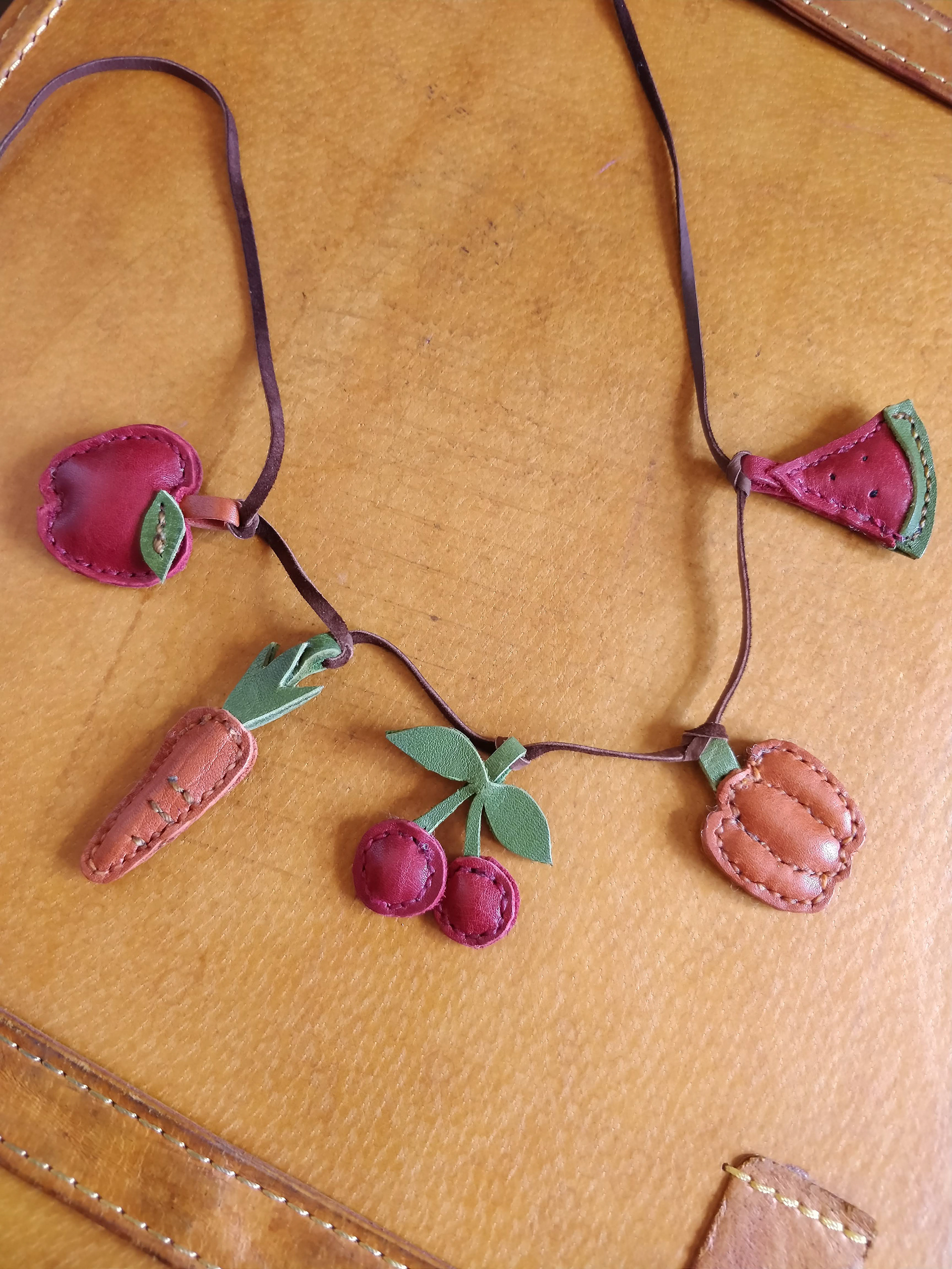 With some colorful leather scraps, I made these fruit necklaces and broaches. Yes, it took time...!